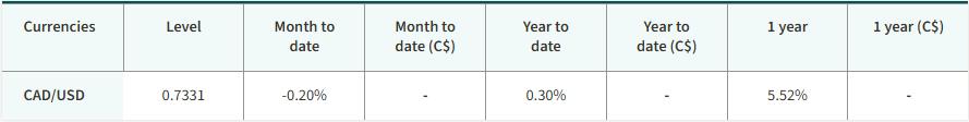 The S&P/TSX Composite Index delivered a strong return over the month, reaching new record highs. U.S. equities posted a small decline. Yields on 10-year government bonds in Canada and the U.S. declined. Oil prices finished higher over the month, as did the price of gold.